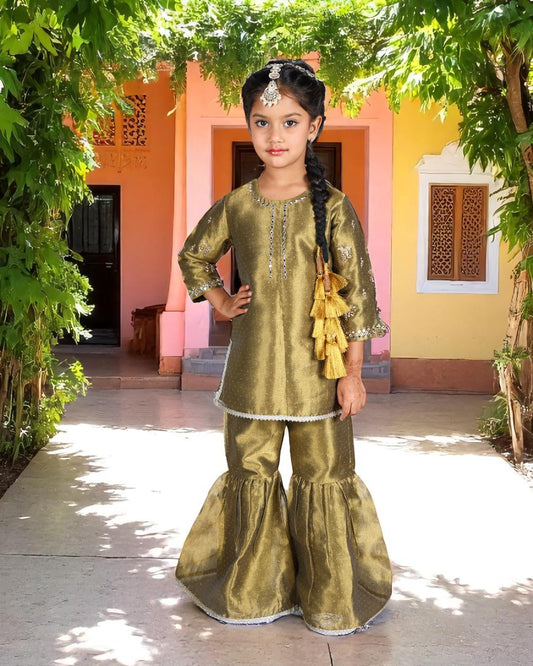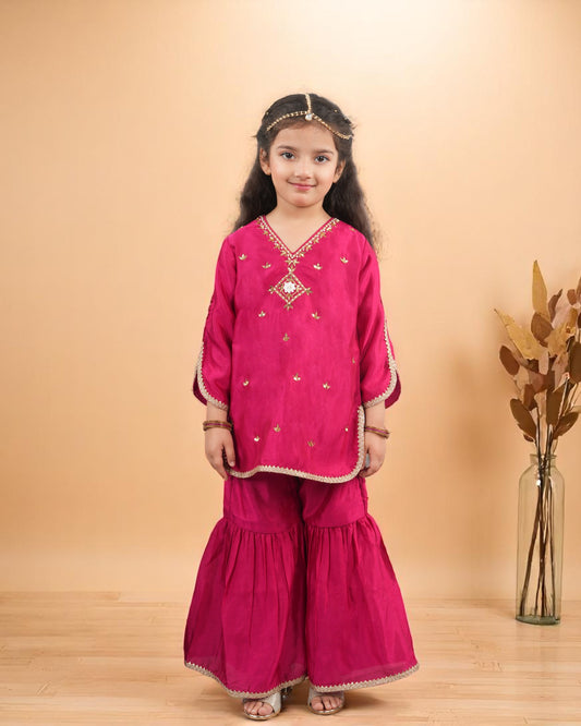Tito Patito Girls’ Festive 3-Piece Sharara Suit – Two-Tone Silk, Handwork & Lace