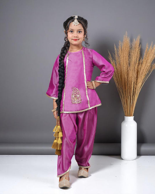 Tito Patito Girls’ 3-Piece Art Silk Suit – Semi Tulip Pant, Handwork & Lace
