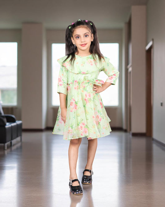 Tito Patito Girls’ Designer Organza Frock – Digital Print, Waistbelt, 3/4 Sleeves