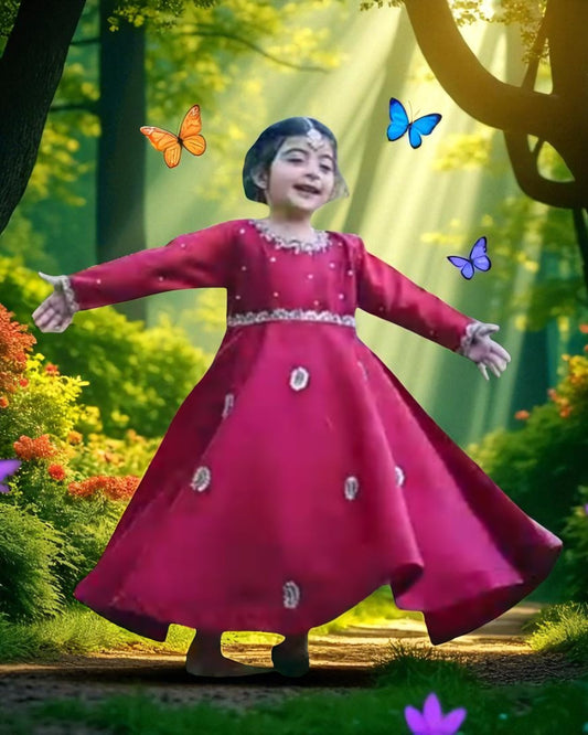 Regal Red Art Silk Kids Gown with Hand Embellishments & Tassel Back