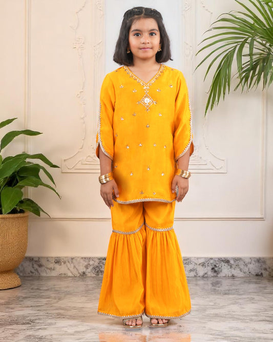 Tito Patito Girls’ Festive 3-Piece Sharara Suit – Two-Tone Silk, Handwork & Lace